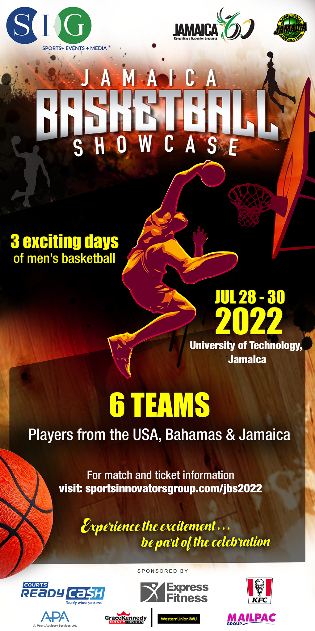 The inaugural Jamaica Basketball Showcase (JBS) is a male championship featuring the best of Jamaica in regions with invited players from USA, Canada and the Bahamas. The three day championship will highlight basketball as one of Jamaica's primary sports. It is our intention at Sports Innovators Group (SIG) to host this as an annual event. We thank our partners for the inaugural event and we look forward to having a successful production.